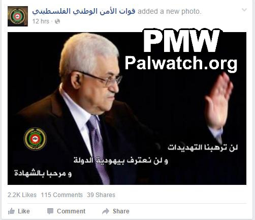 Abbas on Palestinian Authority National Security Forces poster: “We welcome Martyrdom”