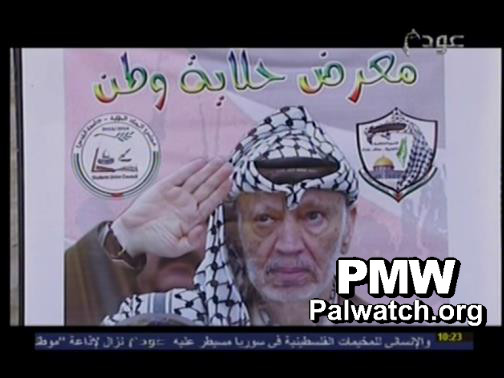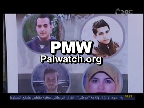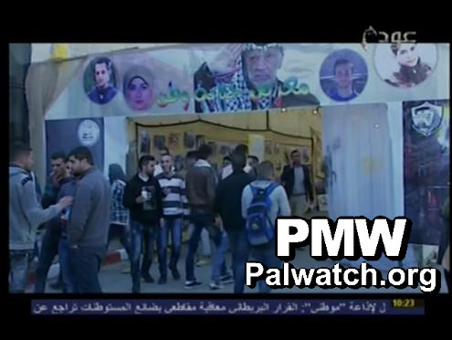 PMW note: After the Al-Quds University had held a chain of readers, the “Homeland Story” exhibit was opened, a product of the cooperation between the Fatah Shabiba student movement and the student union. The Awdah TV report shows a sign for the exhibition with a picture of Yasser Arafat in the center and the Jerusalem “Martyrs” at his side: Baha Alyan, Fadi Alloun, Muhannad Halabi, and Bayan Ayman Al-Esseili. Terrorists who have killed a total of 5 Israelis in their 4 attacks.