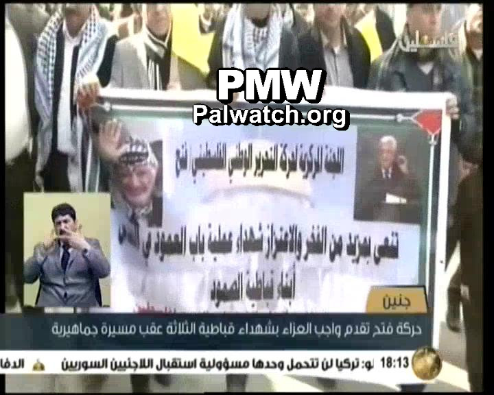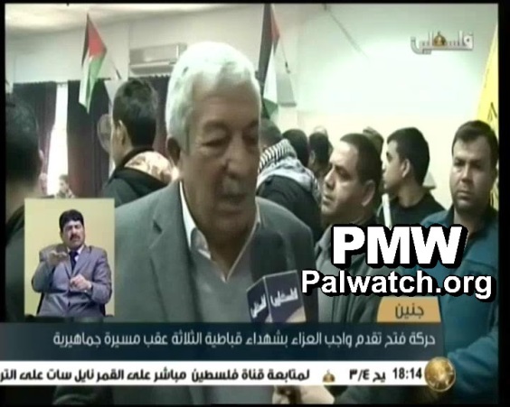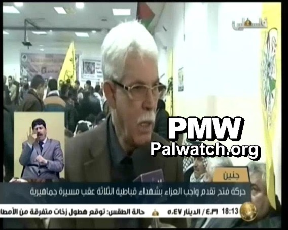 Official PA TV News, report on Fatah procession to console the families of three terrorists from Qabatiya who killed Israeli policewoman Hadar Cohen on Feb. 3, 2016 at the Damascus Gate in the Old City of Jerusalem. Fatah Commissioner for Diaspora Branches and Fatah Central Committee member Jamal Muhaisen and Fatah Commissioner for Mobilization and Organization and Fatah Central Committee member Mahmoud Al-Aloul participated in the procession.