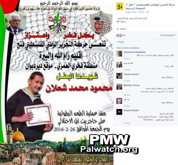 Fatah Facebook honors terrorist stabber as “Martyr” who carried out “heroic stabbing operation”
