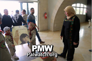 Children are holding a poster with Fatah’s logo, showing a picture of terrorist murderer Dalal Mughrabi and the PA map of “Palestine” that includes the PA areas as well as all of Israel with the text: “The 38th anniversary of the deaths as Martyrs of Bride of Palestine Dalal Mughrabi and her companions.”