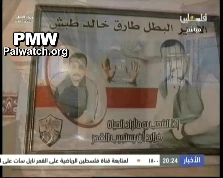 Official PA TV program I Call You, hosting the mothers of imprisoned terrorist Diya Al-Agha, and the mother of imprisoned terrorist Alaa Abu Jaza and another son who is an exiled terrorist, for Mother’s Day. During the program a visit was paid to the family home of the terrorist Tareq Khaled Al-Tabsh, who participated in the bloody lynching of 2 Israeli reservists in Ramallah in 2002. On the wall a poster is seen bearing the official Fatah symbol and pictures of Al-Tabsh.