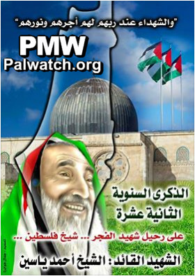 Text at bottom: “The 12th anniversary of the death of the Martyr of Dawn (Yassin was killed while leaving a mosque at the end of dawn prayers –Ed.), the Sheikh of Palestine, the Martyr leader, Sheikh Ahmed Yassin.”