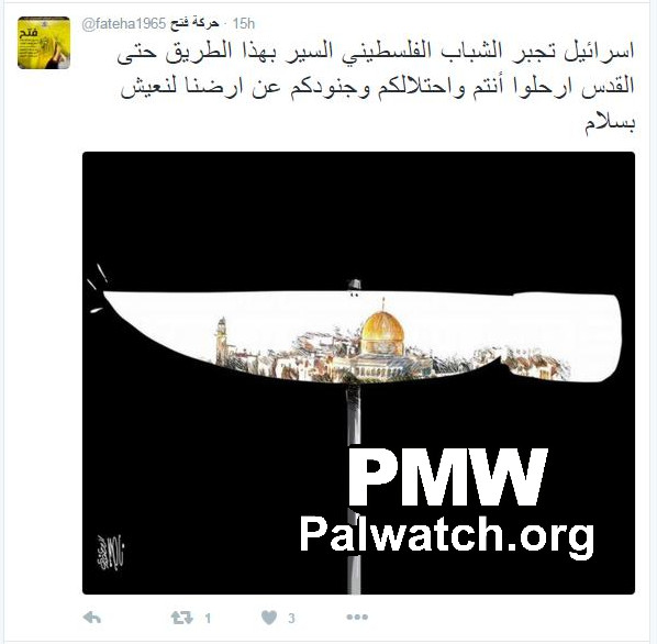 Emphasizing its support for stabbing attacks against Israelis, Abbas' Fatah movement posted a photo of a knife on Twitter, claiming that young Palestinians "follow this path" because Israel "forces" them to: