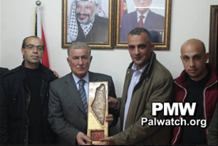 The picture shows Abbas Zaki receiving a plaque with the PA map of “Palestine” on it that includes the PA areas as well as all of Israel.