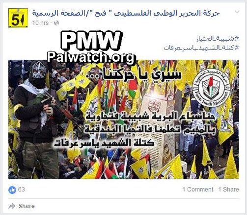 Post on Fatah’s Facebook page by Fatah’s youth movement: “Long live the rifle”
