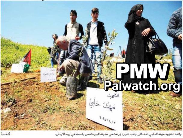 “Yesterday [March 31, 2016], a number of families of Martyrs (Shahids) of the popular uprising (the wave of Palestinian terror attacks against Israelis since September 2015 – continuing –Ed.) planted olive trees bearing the names of their sons and the dates of their Martyrdom in lands in danger of expropriation next to the [Jewish] settlement of Psagot, which is located on lands of the city of El-Bireh. The mother of Martyr Iyad Sajadiyeh (i.e., killed in confrontations with the Israeli army) from the Qalandiya refugee camp north of occupied Jerusalem planted an olive tree sapling during an event organized by the Union of Agricultural Work Committees (an organization supported by international donors, see below -Ed.) in Ramallah to mark the 40th anniversary of Land Day, and said: ‘My son loved the land and died as a Martyr in order to protect it. I see Iyad in this tree, and I will nurture it as I nurtured Iyad.’ […]