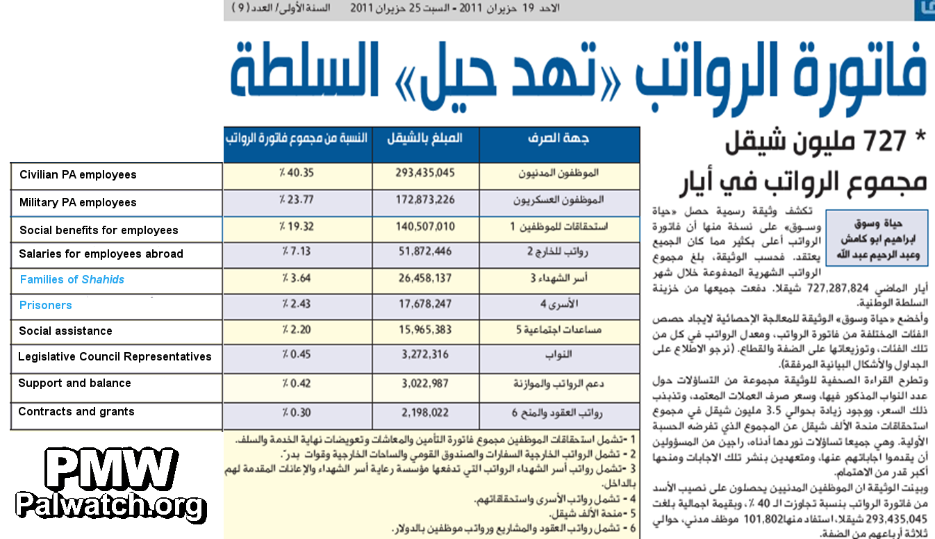 "An official document, a copy of which reached Life and the Market (supplement to the official PA daily), reveals that the cost of salaries [in the PA budget] is much higher than people think. According to the document, the sum of monthly salaries for May 2011 totaled 727,287,824 shekels ($214,412,683.96 USD), paid from the treasury of the [Palestinian] National Authority...